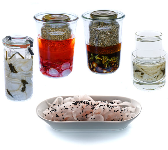 - Ochutnávky různých druhů kvašené zeleniny (obvykle 8 druhů). Většinou se jedná o kvašáky, kimchi s ume octem, bulharské čalamády, barevný nálev, ředkvičky v ume octu, cibulky v sójové omáčce, kedlubnu s červenou řepou, bleskové saláty.